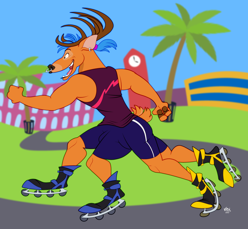 I made mention of a “Barry” in a previous post and figured I should draw him for the sake of curious viewers. I imagined him as a young, slightly scatterbrained collegian from South Beach Florida who regularly rocks the Café ’80s aesthetic. During a conversation I started thinking about multilegged anthros and rollerblades, and I decided (of course) this would be a perfect addition to his character.